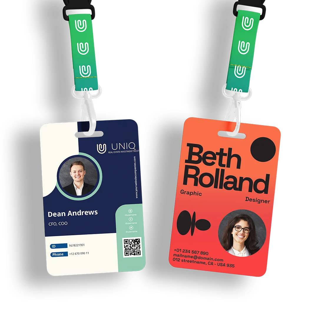 بطاقات تعريف رسمية للموظفين (ID Cards)، مطبوعة بأمان ودقة لتعزيز الانضباط والاحترافية الداخلية.